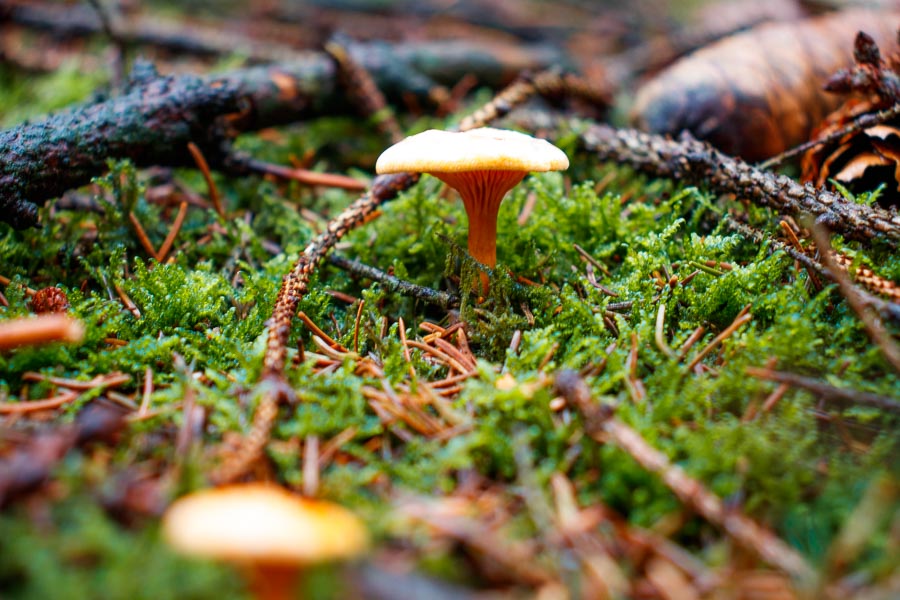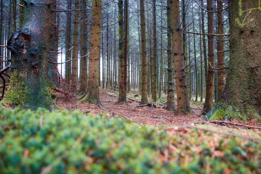Nach einem kurzem Wegstück über Asphalt, zeigte uns die Komoot App an, dass wir wieder nach links in den Wald abbiegen sollten. Diesem folgten wir dann auch für ein paar Kilometer. Der Wald ist sehr abwechslungsreich dort. Nadel- und Laubbäume wechseln sich hier ab und man hat immer mal wieder freien Blick in die Bergische Umgebung. Auch der Waldboden sieht immer wieder toll aus mit seinem Moos und den Pilzen. Einfach herrlich zu dieser Jahreszeit. Ich habe immer die Augen aufgehalten, um einen schönen Fliegenpilz zum Fotografieren zu finden! Leider ohne Erfolg.