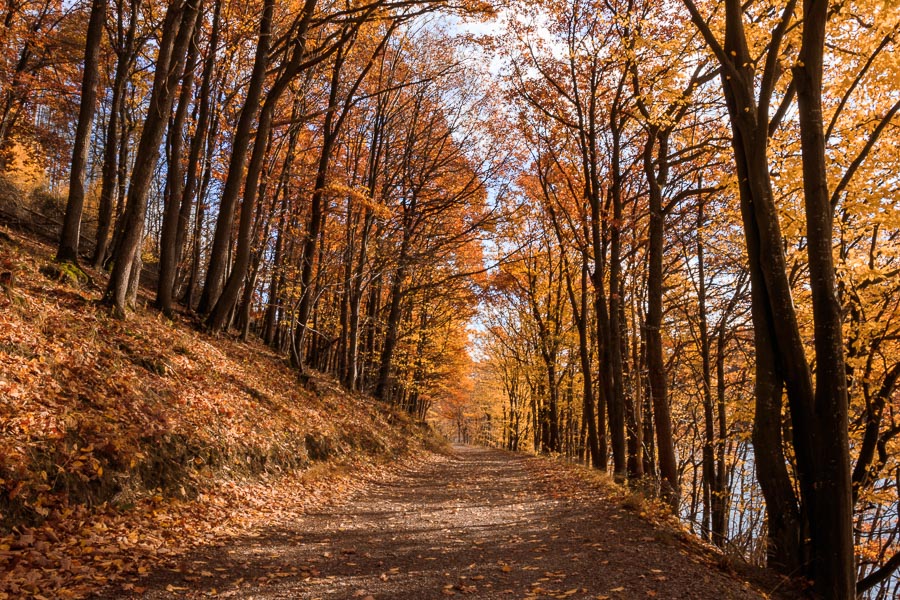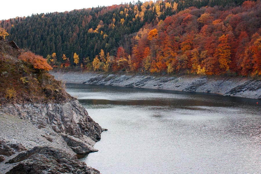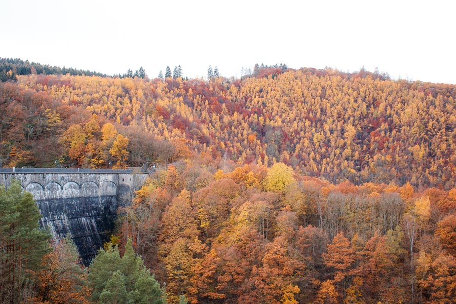 Hier führte uns der Wanderweg ins schöne Urfttal. In diesem schönen Tal schlängelt sich die Rur ein wenig enger durch die bergige Landschaft. Der Weg führte uns immer durch den, in Herbstfarben schimmernden, Wald, gleich am Ufer entlang. Diesen wunderschönen Wanderweg folgten wir bis zur nächsten Staumauer, der Urftstaumauer.